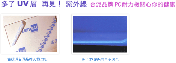 中央氣象局報告:各地紫外線指數偏高,請民眾減少外出... 由於臭氧層破洞逐漸擴大,為避免紫外線直接危害到您的健康、財產安全,請指定採用台泥品牌PC耐力板。 台泥品牌PC耐力板除採用德國最先進之設備及原廠原料外,同時為了顧客之健康保障,更在原料中加摻紫外線吸收劑,再覆以高濃度之UV原料,以共押出(Co-Extrusion)技術製成,雙重保障,品質優越,具有抗紫外線長效耐候之特性。