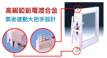 採用高級錏鉛電渡合金氣密連動大把手設計,當轉動把手時上下撐塊依齊作用更能緊迫密氣